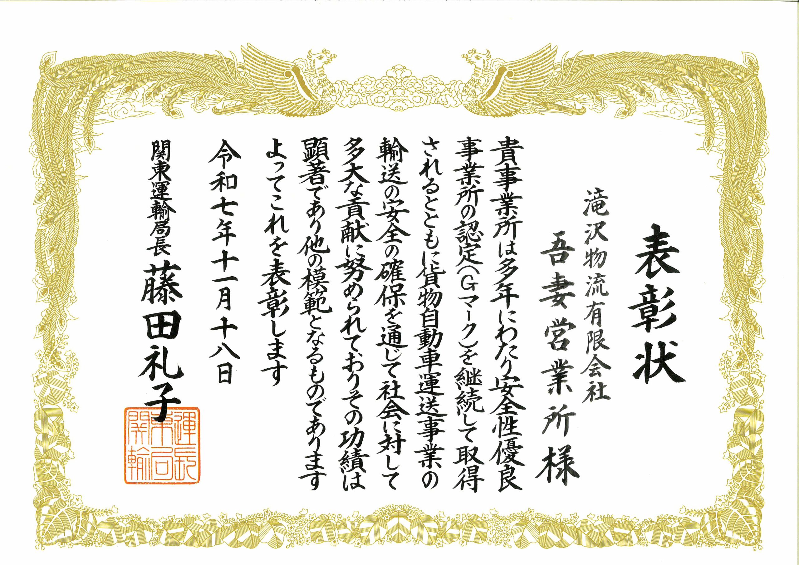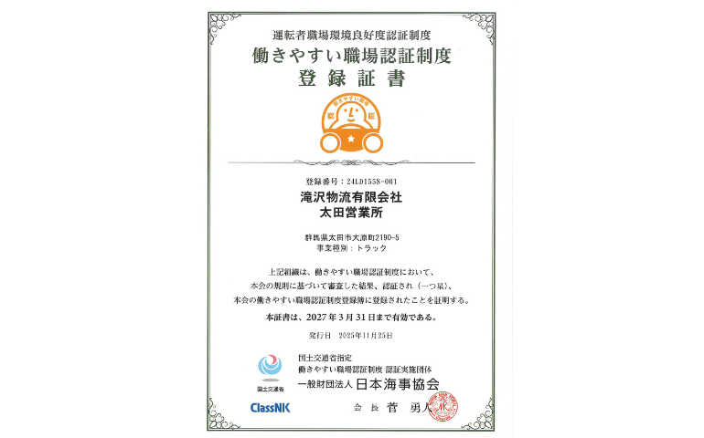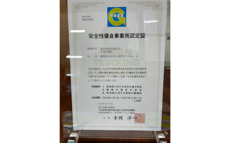当社は安全性について高い評価を得たトラック運送事業者に与えられる「安全性優良事業所」として認定されています。