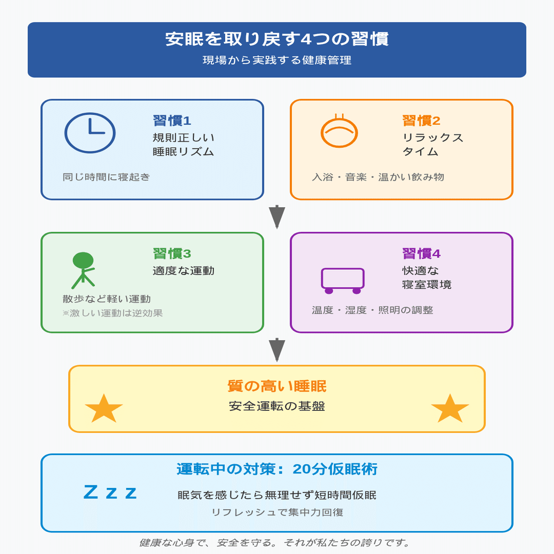 この記事では、「健康経営優良法人」としても認定されている私たちが、質の高い睡眠を確保し、心と体を鍛え、いつまでも安全運転を続けるための具体的な方法を、現場の知見に基づいて徹底解説します。