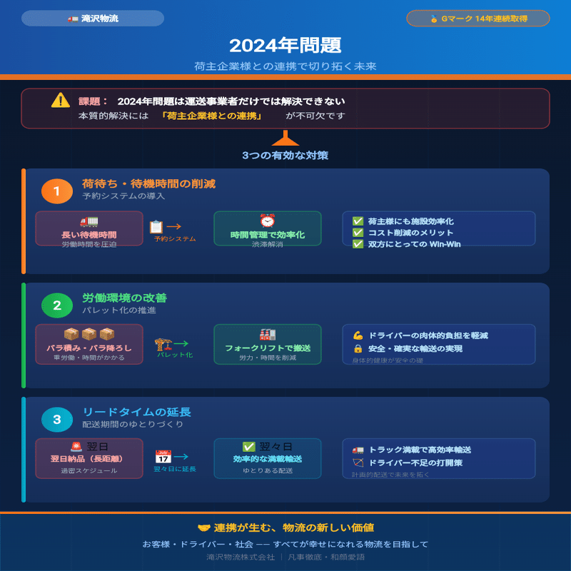 短期的な利益や効率だけを追求するのではなく、良きパートナーとして連携を深めることで、この「2024年問題」を一緒に乗り越えていきたいと考えています。