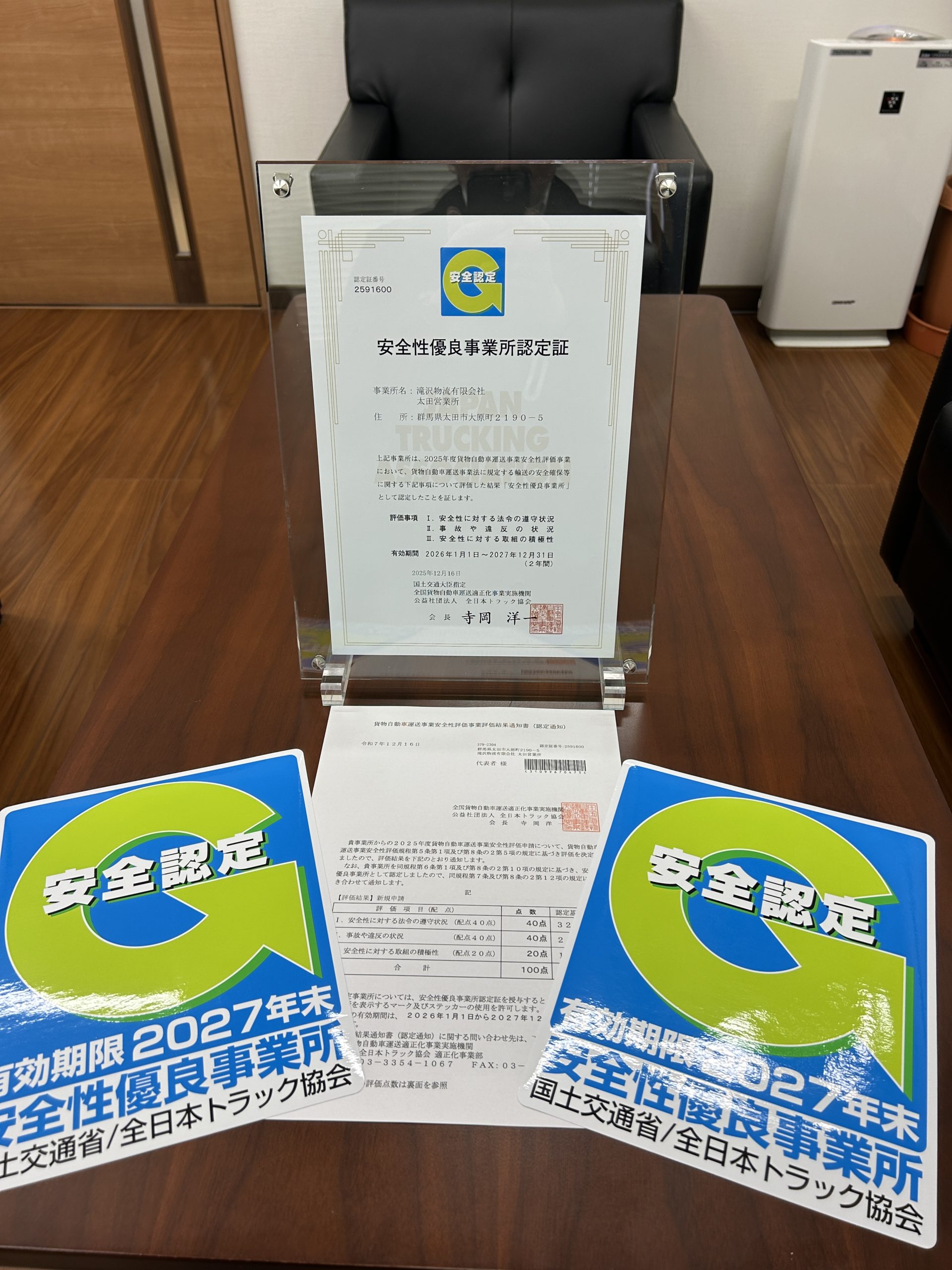 この度、滝沢物流有限会社 太田営業所は、全国貨物自動車運送適正化事業実施機関より「安全性優良事業所(Gマーク)」の認定を受けましたことをご報告いたします。